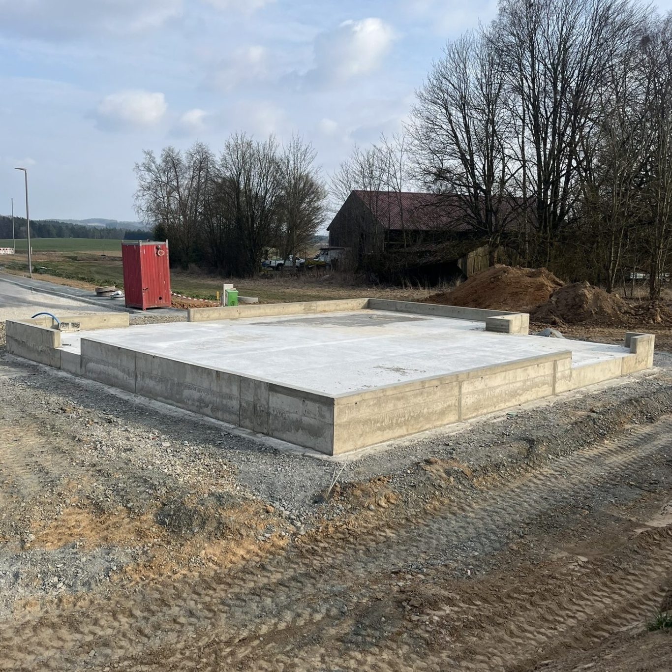 Für dieses Neubauprojekt haben wir den Aushub übernommen, die Leitungen für Abwasser, Wasser und Strom fachgerecht verlegt und anschließend die Bodenplatte gegossen.
