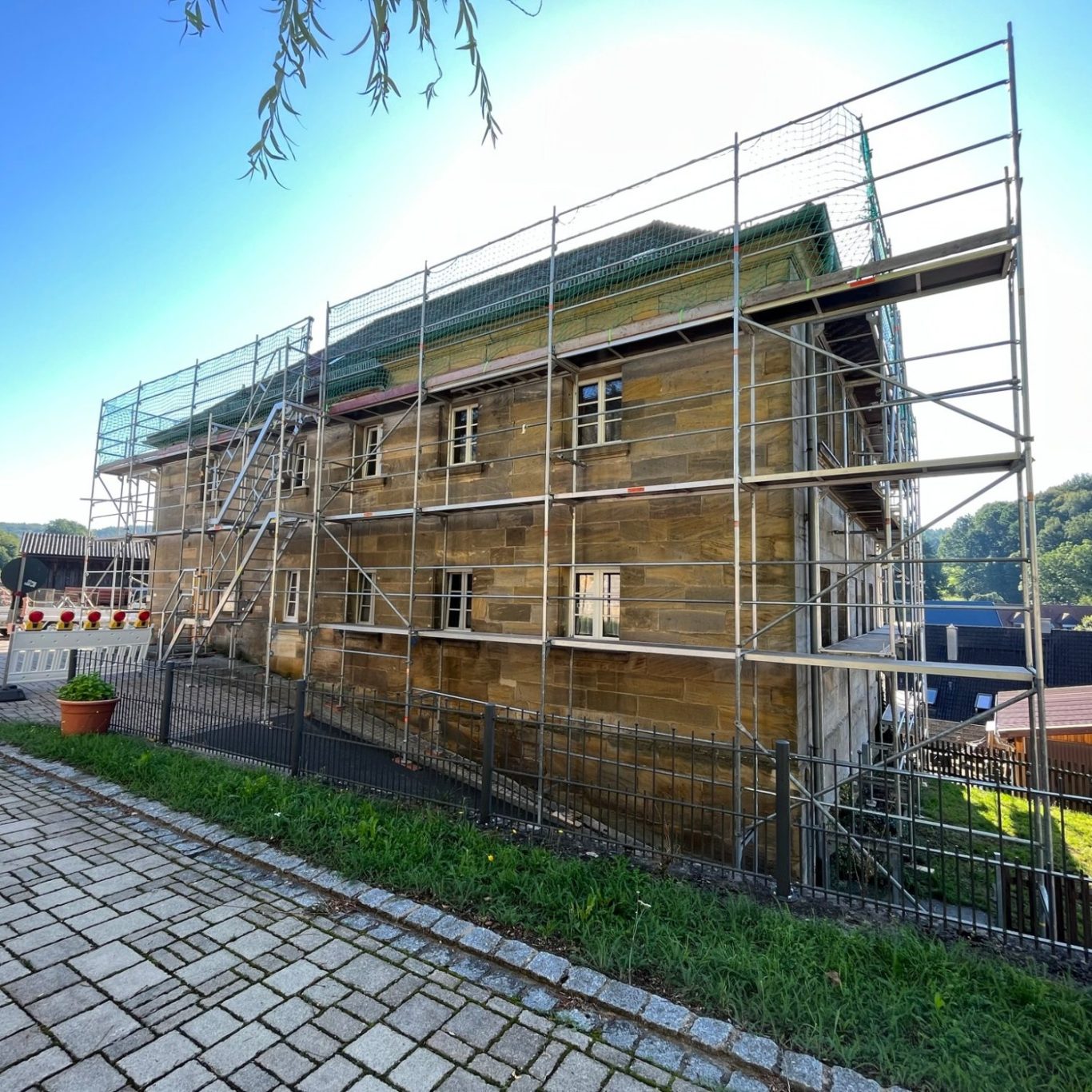 Für dieses Gebäude stellten wir ein stabiles, optimal angepasstes Gerüst, das eine sichere und effiziente Dachsanierung ermöglicht.