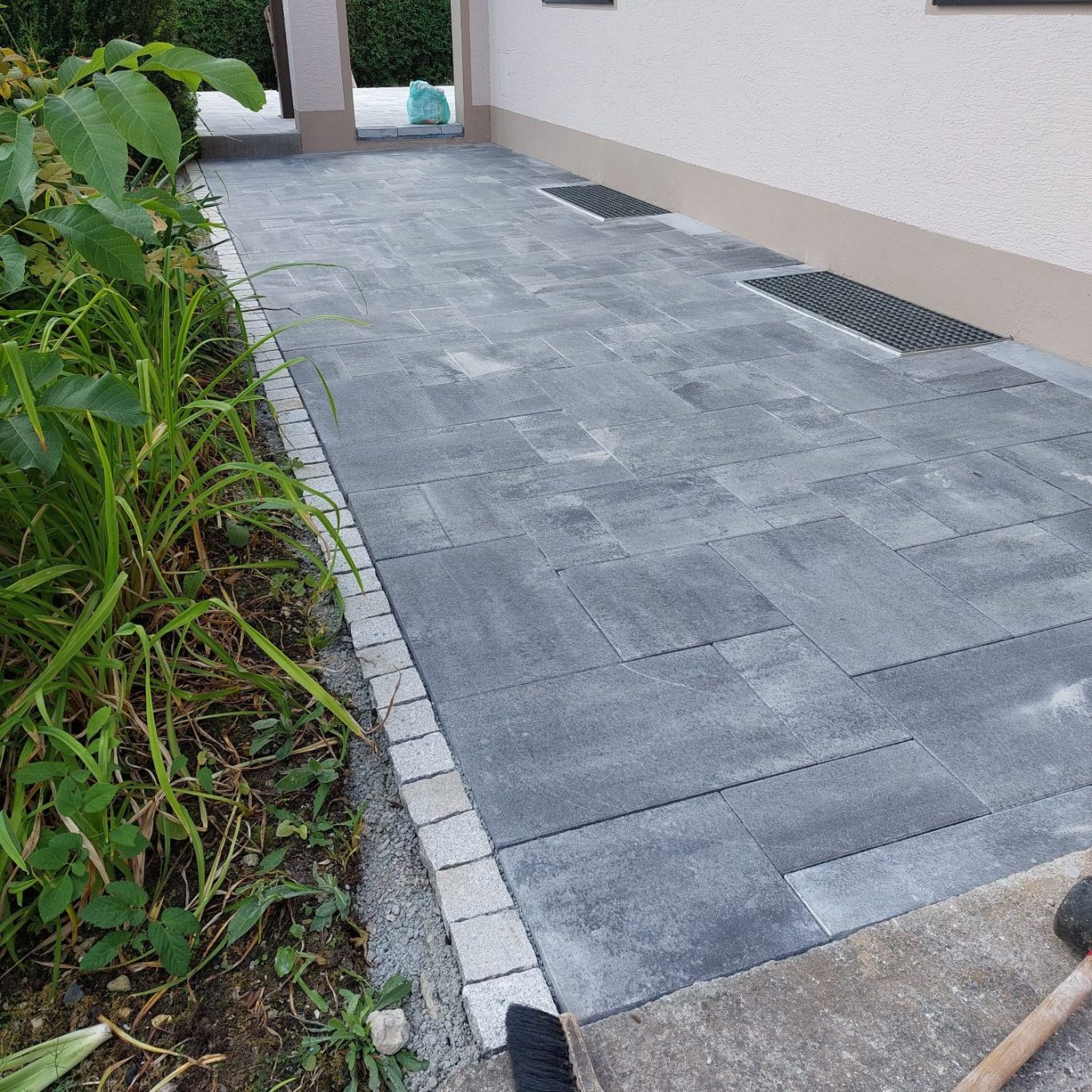 Hier wurde die Terrasse erweitert, mit neuen Randsteinen eingefasst und das Pflaster komplett neu verlegt.
