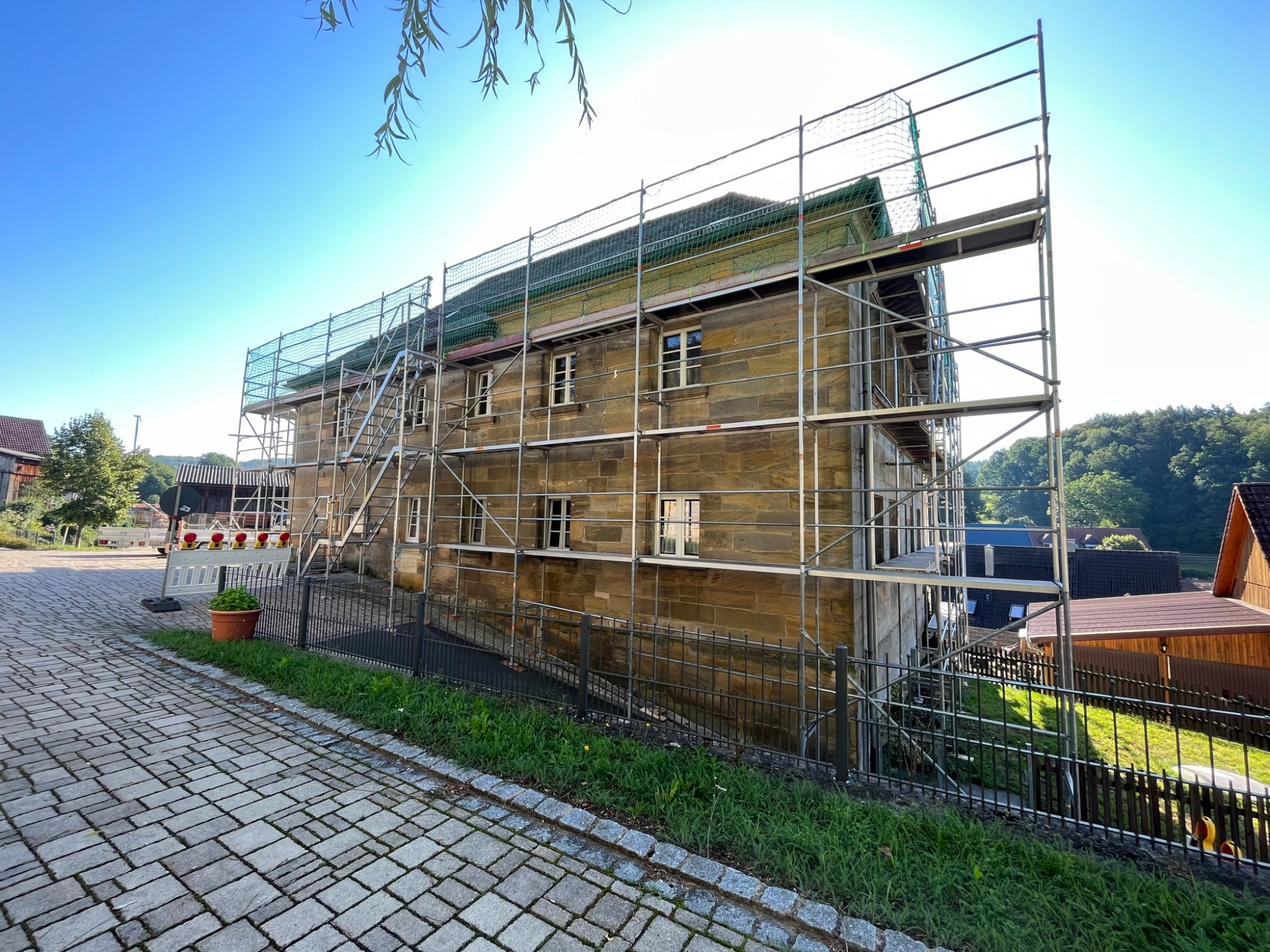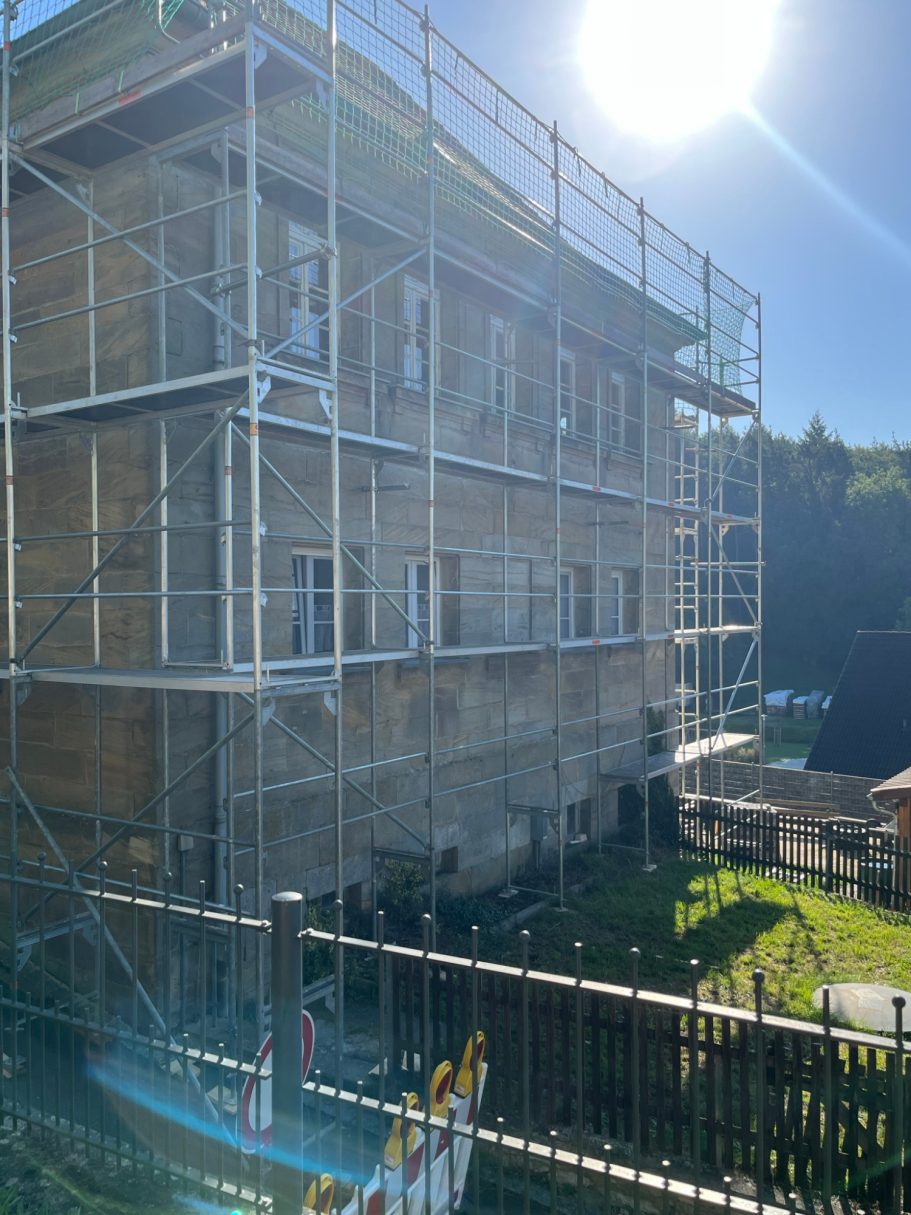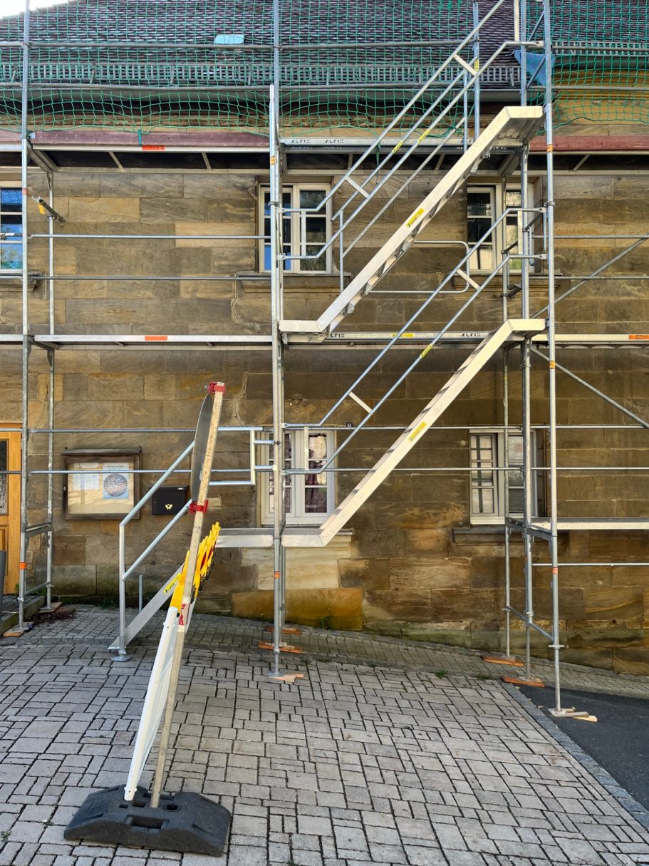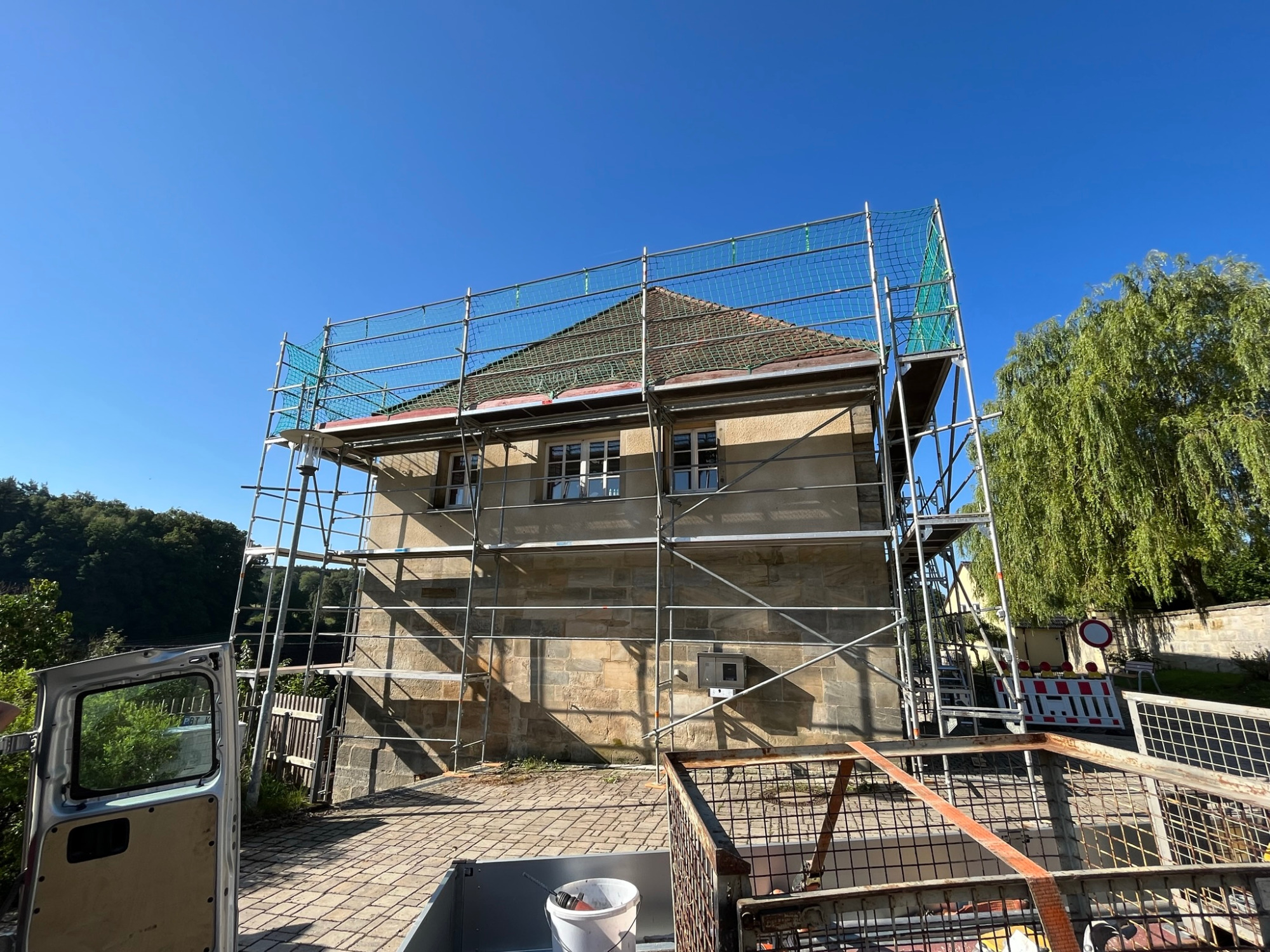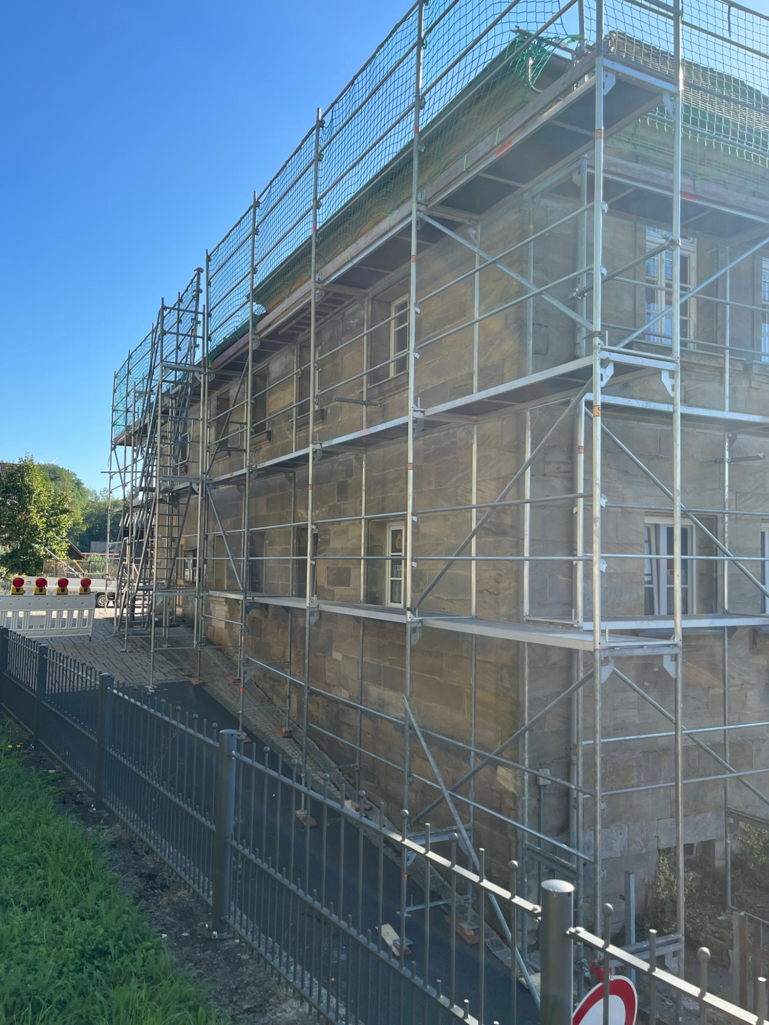 Für dieses Gebäude stellten wir ein stabiles, optimal angepasstes Gerüst, das eine sichere und effiziente Dachsanierung ermöglicht.