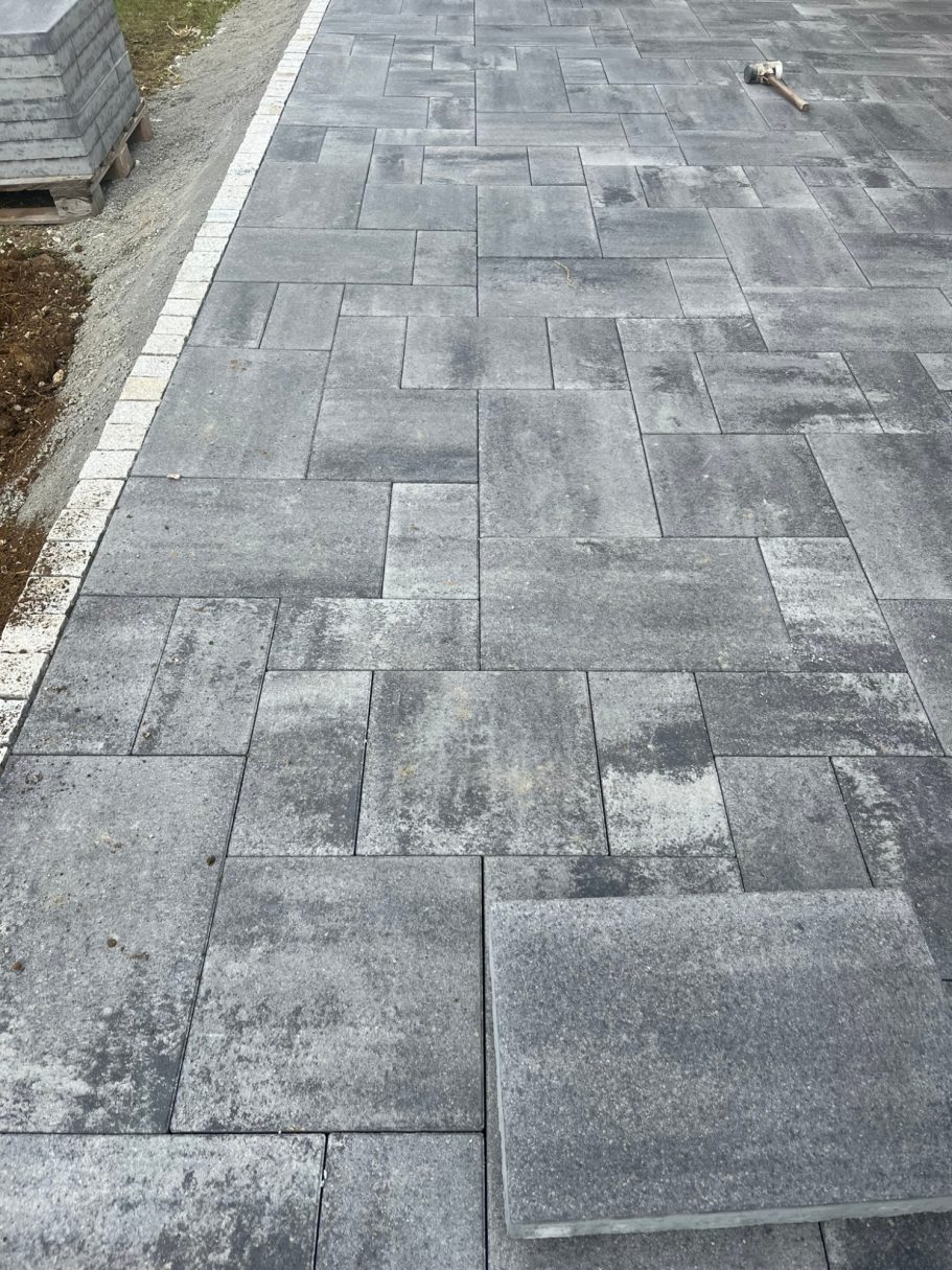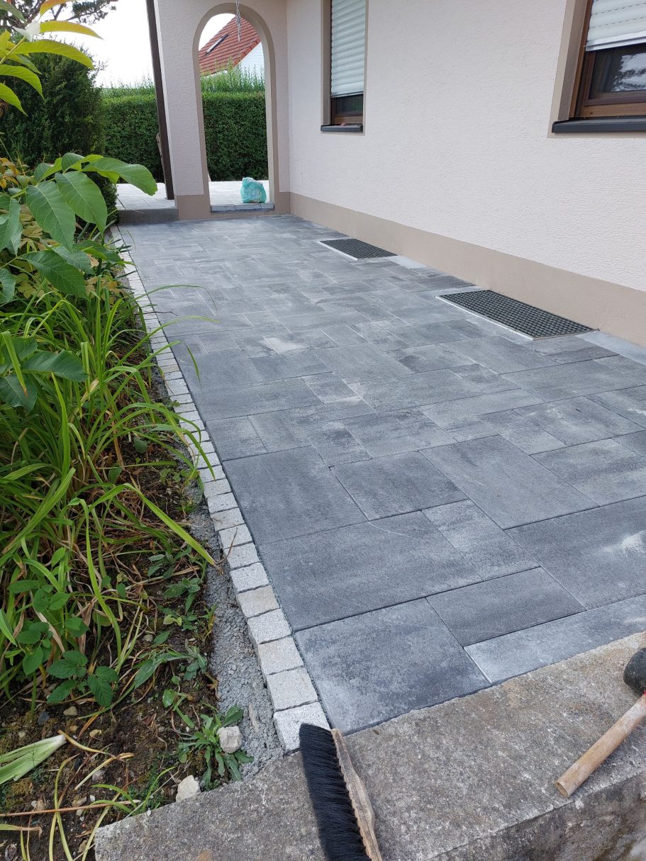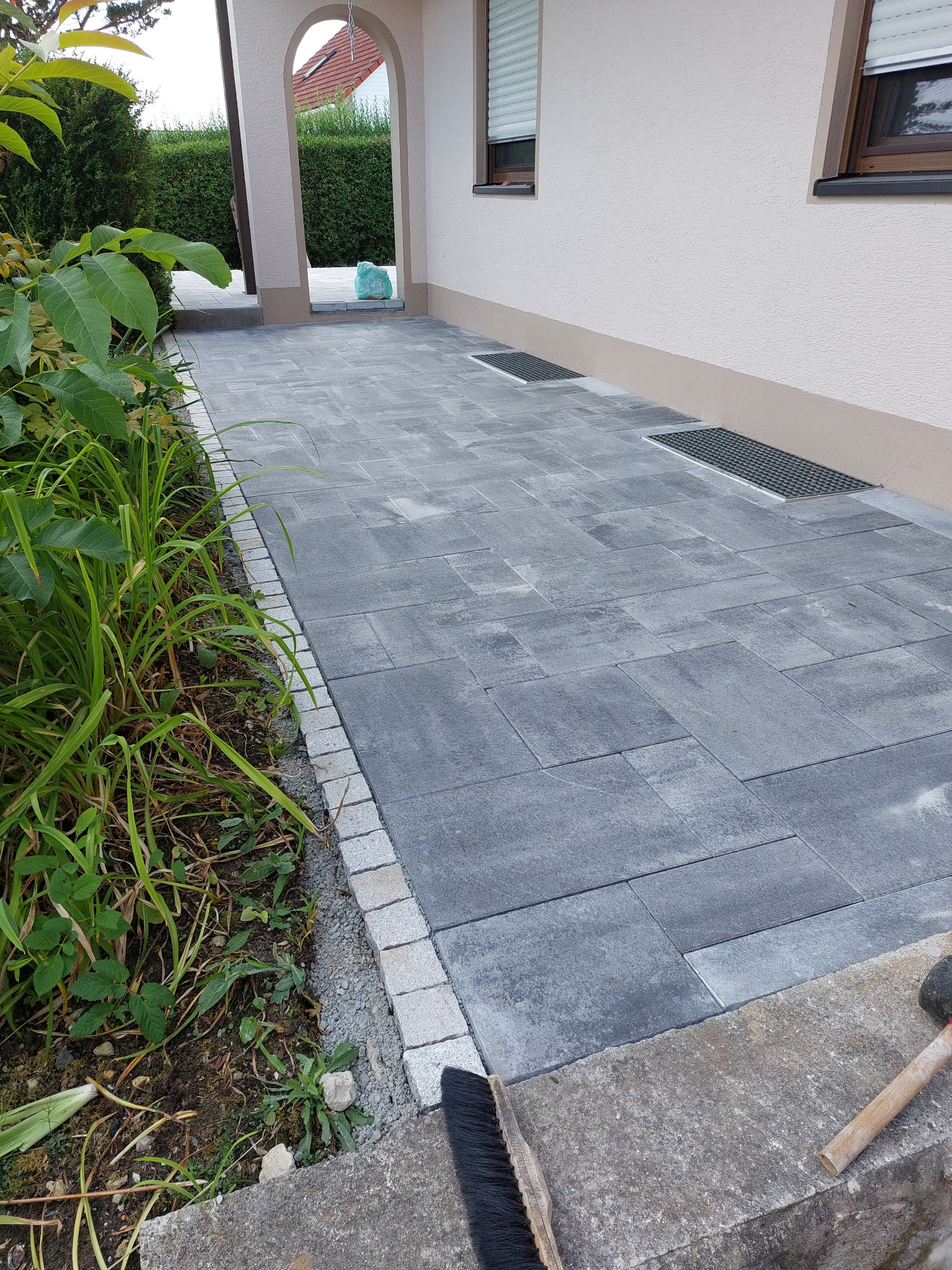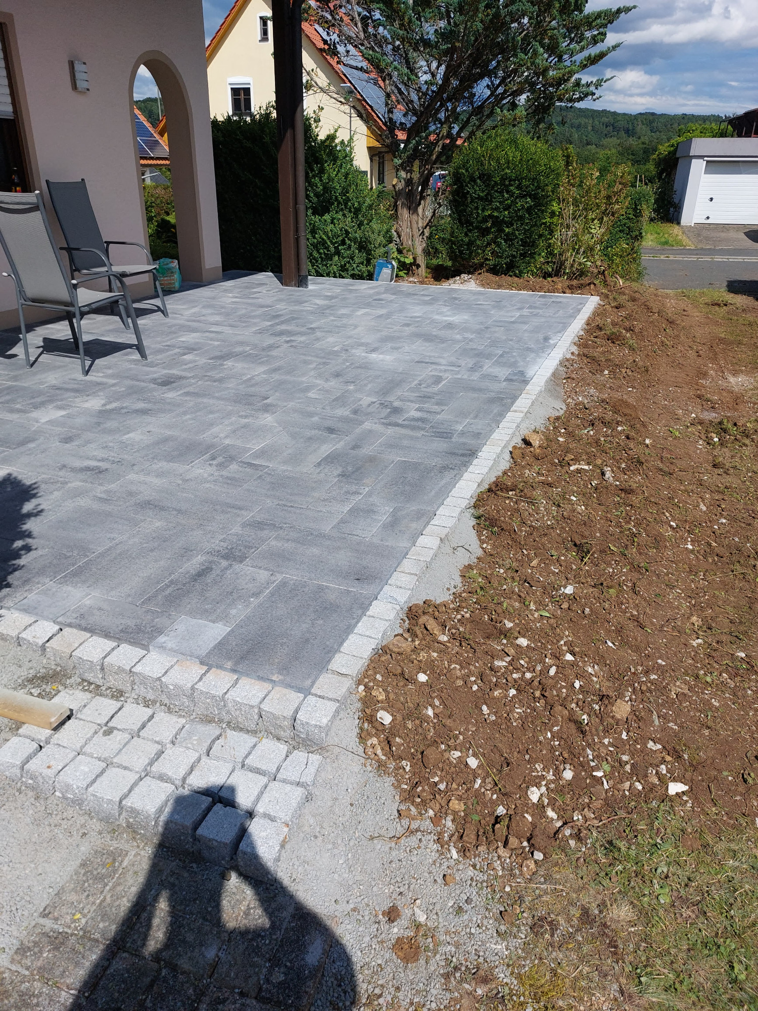 Hier wurde die Terrasse erweitert, mit neuen Randsteinen eingefasst und das Pflaster komplett neu verlegt.